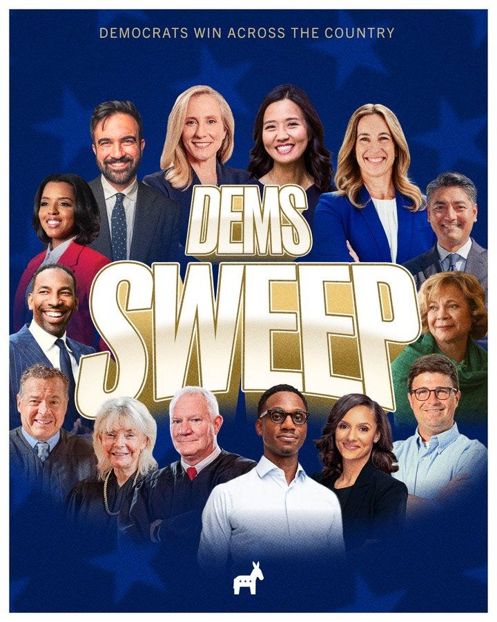 Last week, voters delivered a reckoning to Donald Trump as Democrats swept the election season, proving that voters are ready to stand up against MAGA Republicans who have betrayed them. We won top to bottom, with historic victories from Governor-elect Abigail Spanberger to breaking the GOP supermajority in the Mississippi state Senate.