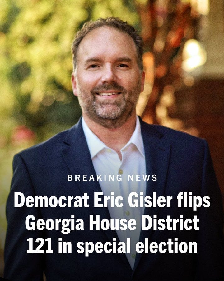 Last week, Democratic candidate Eric Gisler clinched victory in the race to represent District 121 in the Georgia state assembly. Gisler flipped a Trump +12 district in another Democratic overperformance this year, showing that our momentum isn’t slowing down.