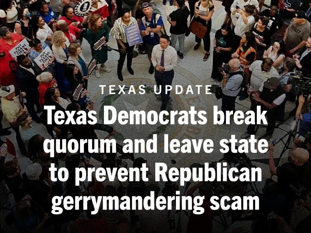 Texas Democrats are putting everything on the line to stop this corrupt anti-democratic assault. Send a letter to Texas House Democrats thanking them for putting Texans first and breaking quorum to prevent Donald Trump and Texas Republicans’ attempt to rig the 2026 congressional map.